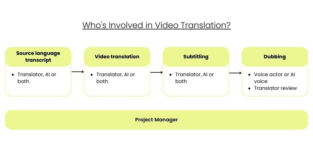 The translation workflow is a multi-step process designed to ensure a high-quality output. A strong process will have checks and balances in place to maintain quality and brand consistency throughout each step. Multiple key players specialize in different aspects of the process. Translators and QA specialists ensure the final output captures the original intent, cultural nuances, and maintains brand voice. Localization managers and project managers ensure projects stay on schedule. AI technology can also play a key role to streamline various steps.